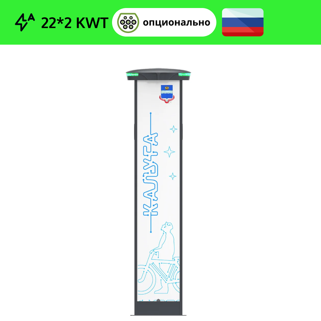 Монтаж как на открытых площадках, так и в хорошо проветриваемых помещениях. Укомплектована двумя розетками стандарта Type2, опциональной возможностью комплектования зарядными кабелями «Type2 – Type2», «Type2 – GB/T AC», «Type2 – Type1», «Type2 — Tesla» и фиксацией кабеля в разъеме зарядной станции.